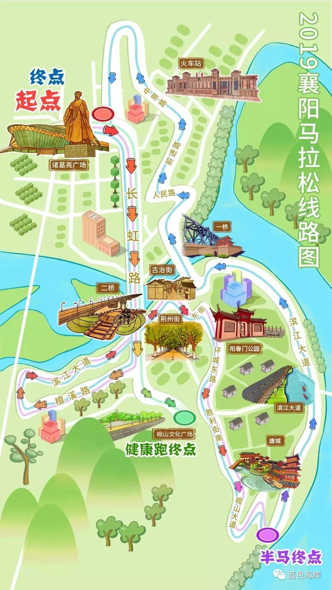 (3)健康跑线路:诸葛亮广场(起点)——长虹路——左转环城南路——岘山文化广场(健康跑终点),总里程为7km。
