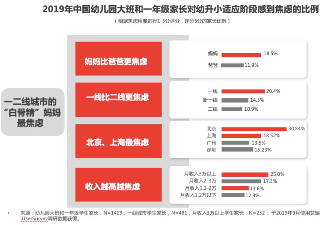 不难发现,家长对幼小衔接的焦虑与重视程度与日俱增,特别是深受高等教育影响的中产人群,往往更有“远虑”,早早选择通过幼小衔接教育帮助孩子平稳过渡,培养入学自信,并且不断加大在孩子身上的教育投入。