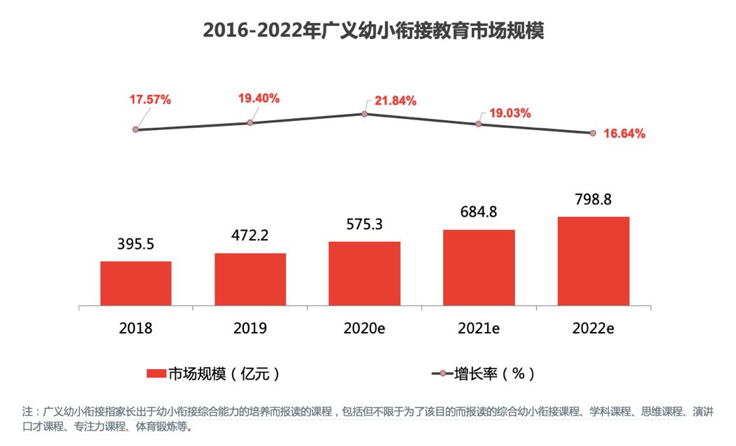 2019年5月,教育部办公厅发布《关于开展2019年全国学前教育宣传月活动的通知》,确定宣传主题为“科学做好入学准备”,提出促进幼小协同,双向衔接,对适龄儿童的入学准备教育日益重视。而在人口红利、消费升级和教育前置等多重驱动力下,2019中国幼小衔接市场规模已接近500亿元,预计2022年将达800亿元。
