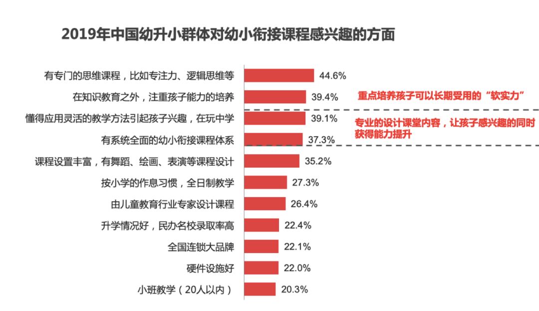 这也意味着,激发能力和学习兴趣的课程设计已成为吸引家长报读的关键,幼小衔接教育升级势在必行。未来,幼小衔接机构应注重专业性、综合性和延续性,突破学前突击班的概念,才能在市场占据一席之地。