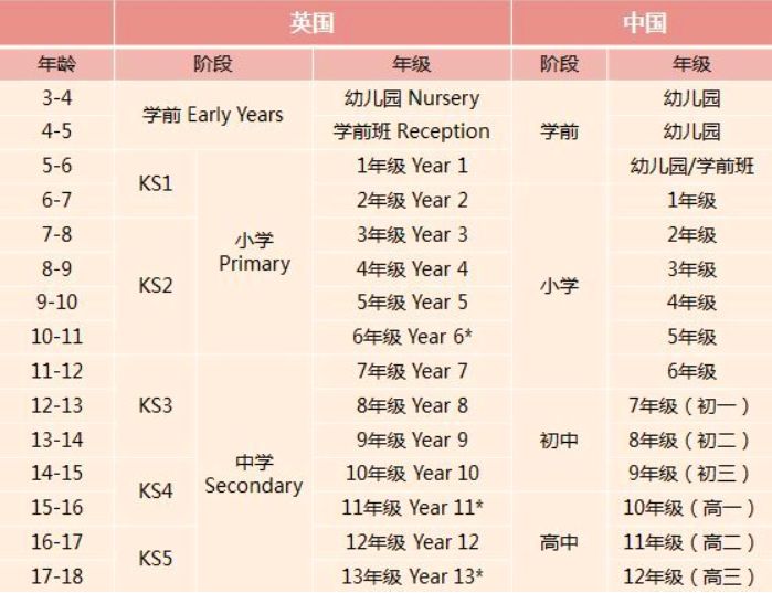 首先,我们一起来研究一下这个将英国学制和中国学制对应起来的表格。