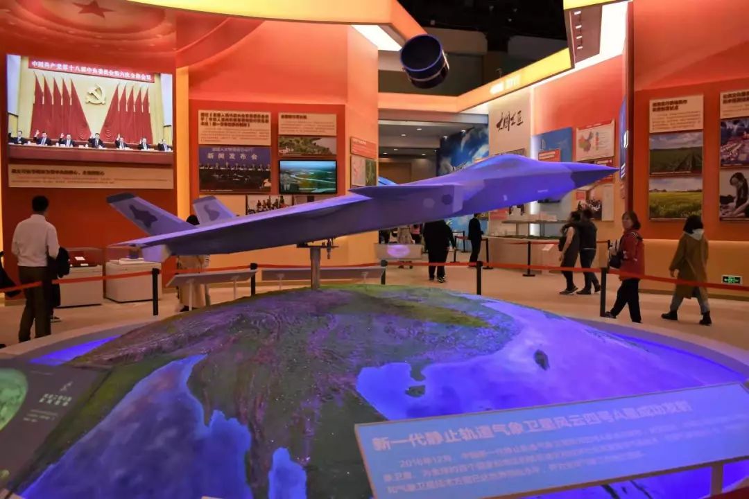 记录开国大典历史时刻的影像,纪念新中国建设的第一条铁路成渝铁路建成通车的浮雕,寓意1977年恢复高考以来几代人命运得以改变的场景,显现1998年抗洪抢险中万众一心、众志成城的场面,再现北京奥运会盛况的光影设计,体现“绿水青山就是金山银山”生动实践的沙盘,“天眼”,港珠澳大桥等模型…