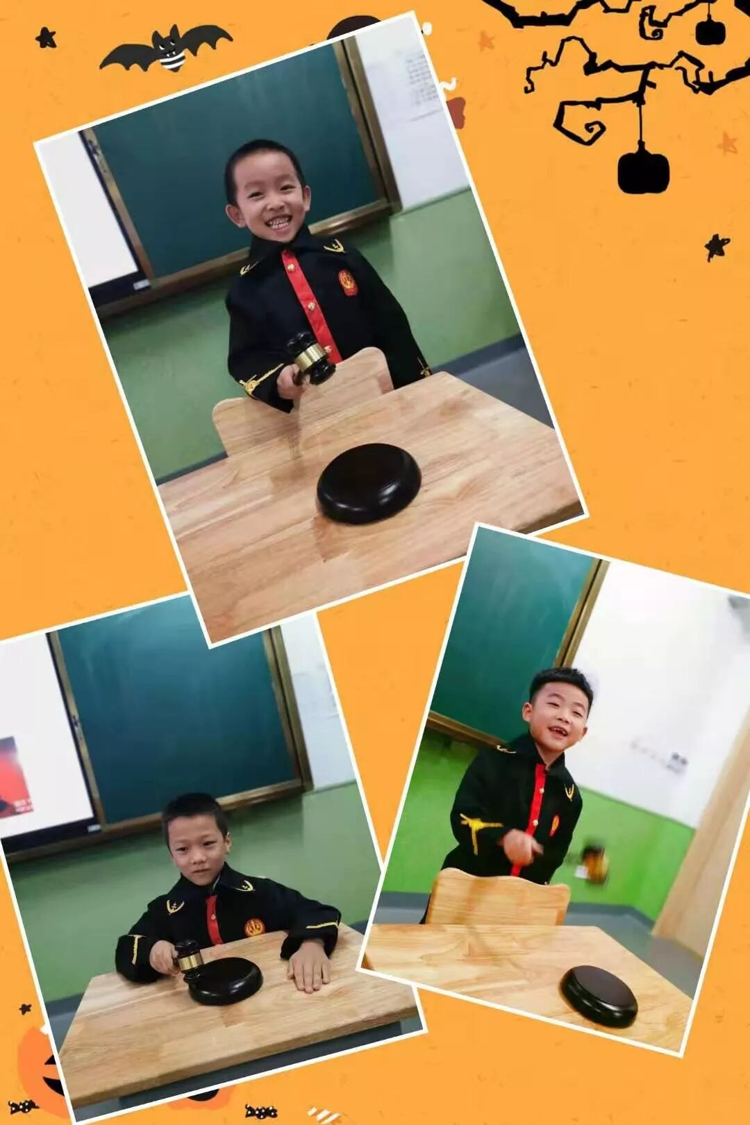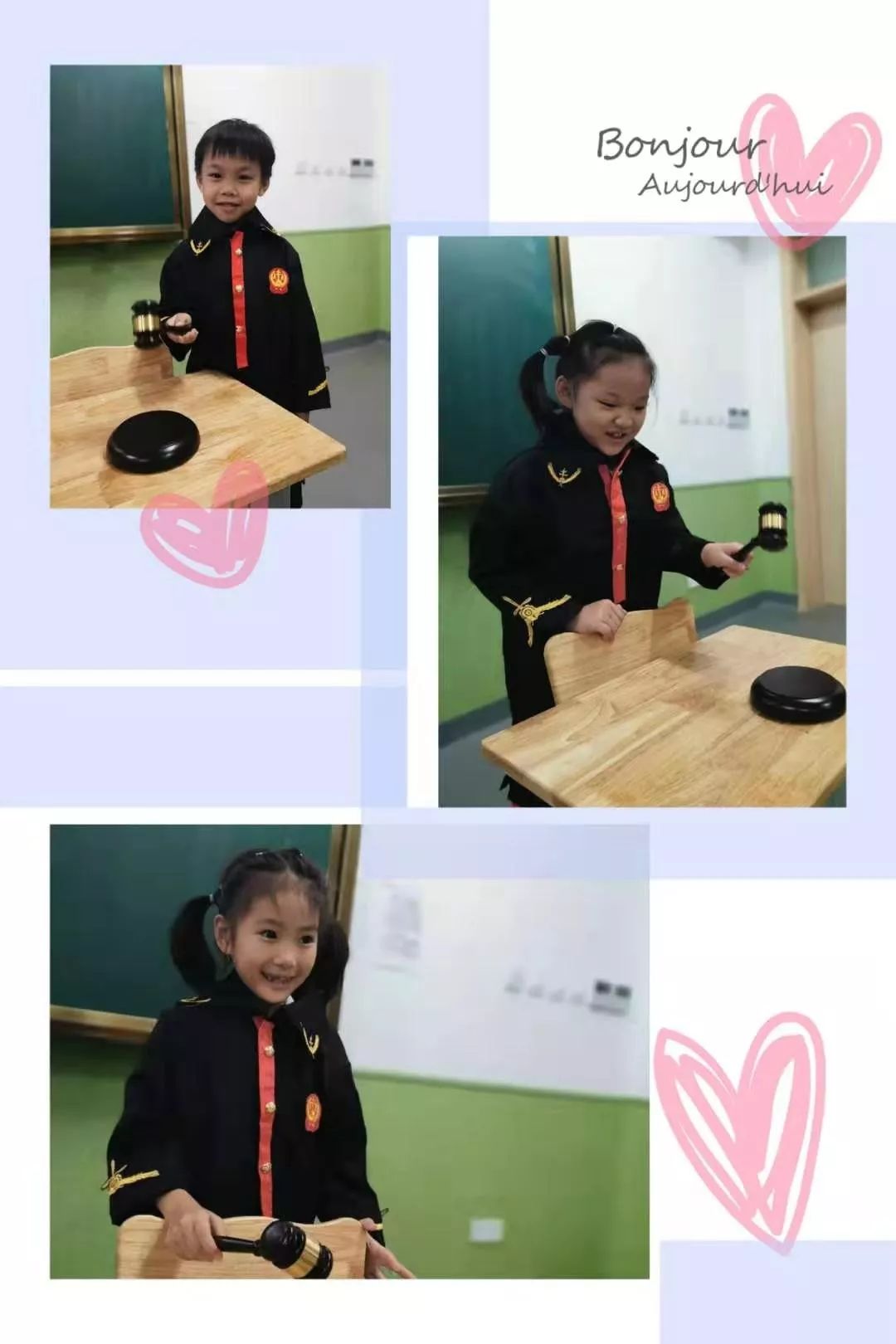 杨老师向大家介绍了平常工作中所使用的两大“法宝”——法袍和法槌,还带来了小法袍和小法槌,同学们穿上了小法袍,手握法槌过了一把 “小法官”的瘾。