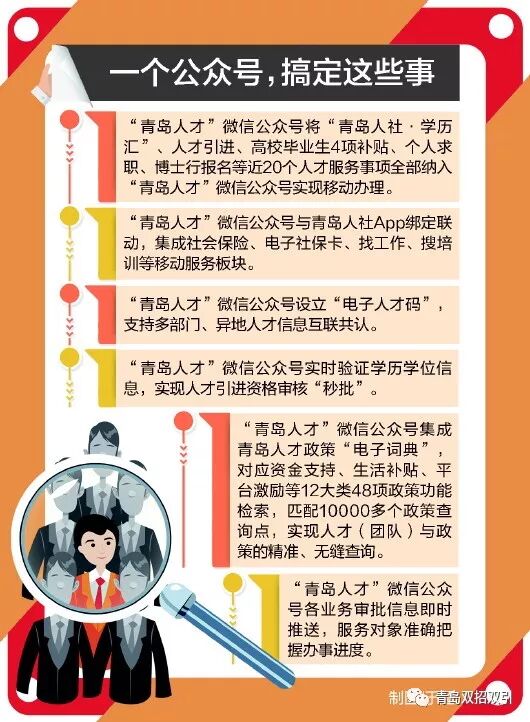 据介绍,“青岛人才”微信公众号打破常规以信息推广为主要功能的单一模式,充分利用其便利性,以“移动办事”为突出重点,打造多功能的人才“移动办事大厅”:将“青岛人社·学历汇”、人才引进、高校毕业生4项补贴、个人求职、博士行报名等近20个人才服务事项全部纳入“青岛人才”微信公众号实现移动办理;与青岛人社App绑定联动,集成社会保险、电子社保卡、找工作、搜培训等移动服务板块;设立“电子人才码”,支持多部门、异地人才信息互联共认;实时验证学历学位信息,实现人才引进资格审核“秒批”;集成青岛人才政策“电子词典”,对应资金支持、生活补贴、平台激励等12大类48项政策功能检索,匹配10000多个政策查询点,实现人才(团队)与政策的精准、无缝查询;各业务审批信息即时推送,服务对象准确把握办事进度。