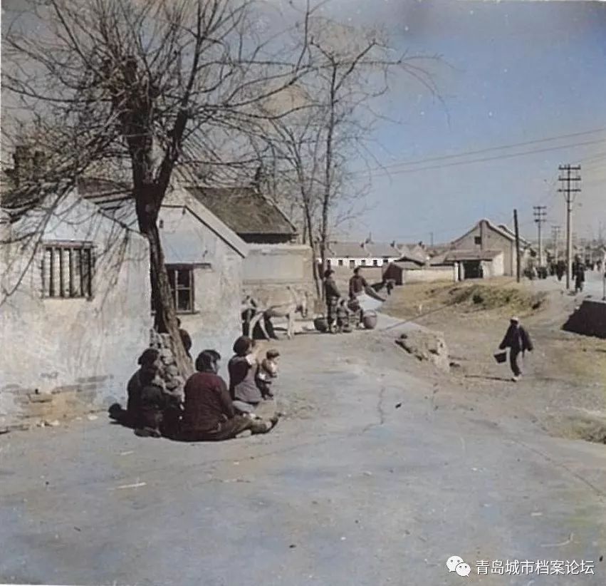 远处的多层建筑,是河北路上的“五起楼”;再近一点可以隐约看到那个时期的“天桥”——“国民桥”;右边树荫近处可以看到朝城路口;左侧的两层楼房,是后来青岛食品厂门口南侧的建筑。这栋建筑直到2007年才被拆除。 黄岛路上的围观