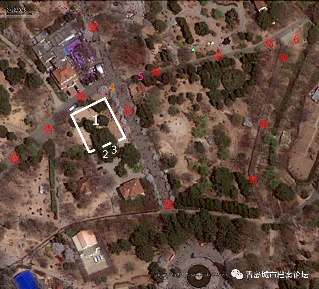 这里需要做一下特别说明。此图在初与众位师友讨论时,本人误以为远处稍露出的建筑一角是“公园饭店”的屋顶,由此判断此图是由东向西拍照的。但如果是这样,那么太阳的位置就不对了!所以本人错误地认为此照片反了。然而,这恰恰是一个严重的谬判! 使我重新修正了判断的是图片左面的竖牌。这个竖牌应该是“海棠路”的路牌。之所以看不出牌上的字迹,是由于字迹褪色和光线反射的缘故。如果图片是由东向西拍照的话,这个路牌的位置是在“海棠路”的中段。而在一条短短的路上,路牌竖在道路的中段是没有意义的,也不合常规。故此重新判定这个路牌的位置应该是竖在“海棠路”西端口的北侧靠近“樱花路”拐角的近处。