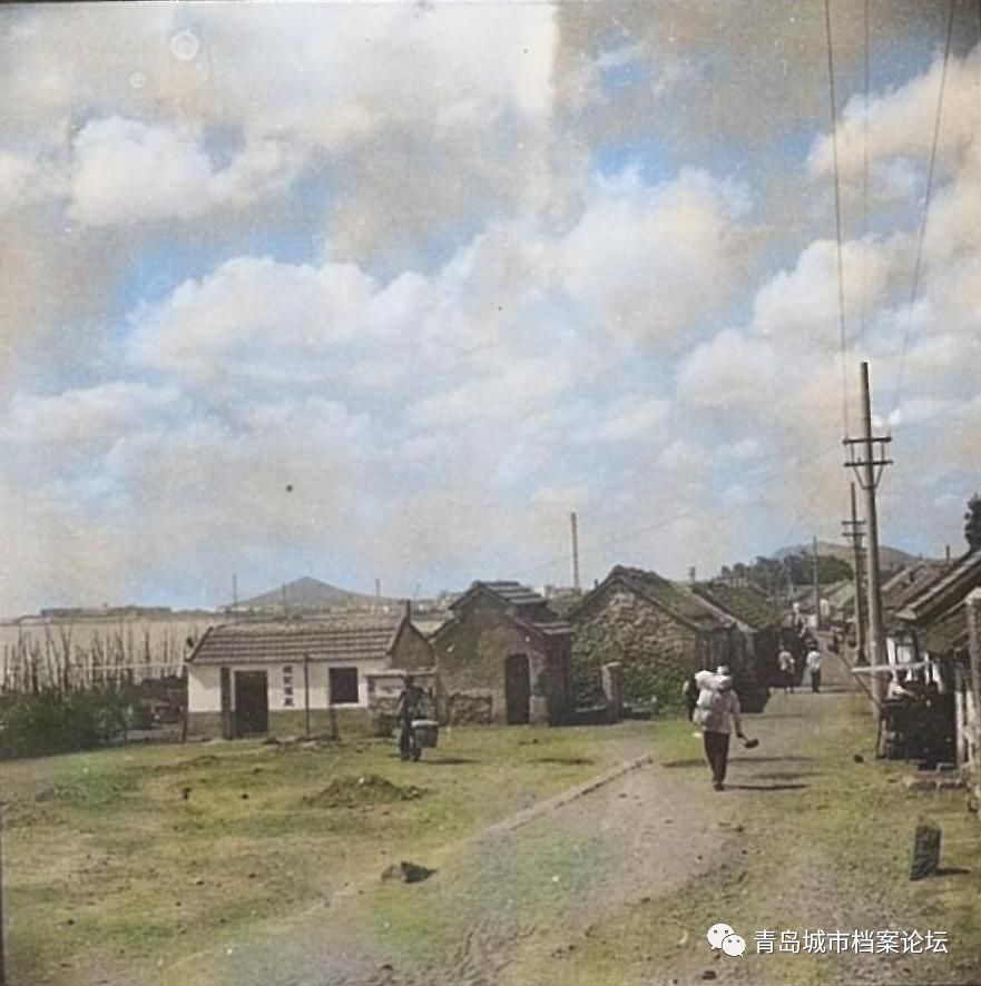 此图请教过“老沧口”后得到的描述是:图中的景象是位于“国棉六厂”以北的“下街”,即现“沧台路”一带。图片左面的海已经填成陆地,远处的山,左边是“烟墩山”,右边是“楼山”。