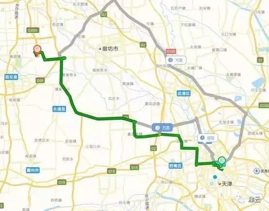 线路1:全长约110公里,用时1小时54分钟。途经狮子林大街、京津路、京津快速、滨保高速、京台高速、L77省道等。