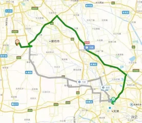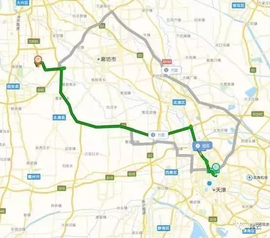 路线2:全长约142.5公里,用时近2小时7分钟,特点是走高速较多,途经津蓟高速、京津高速、密涿高速、京台高速等。