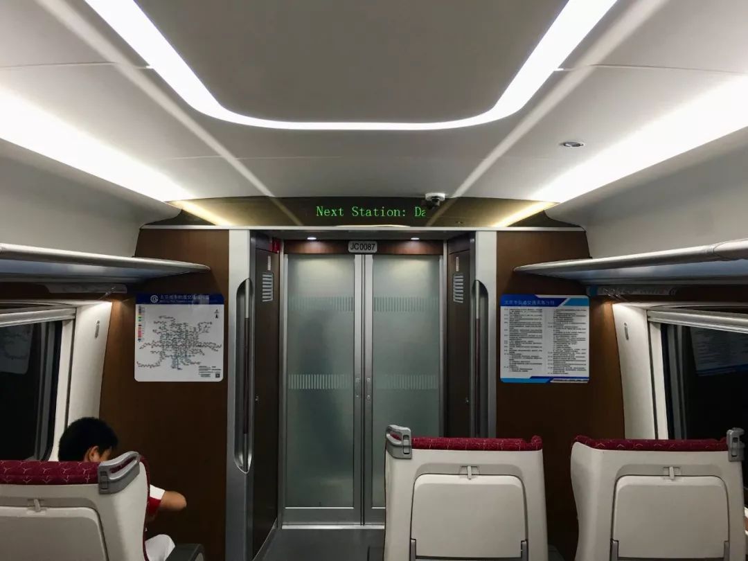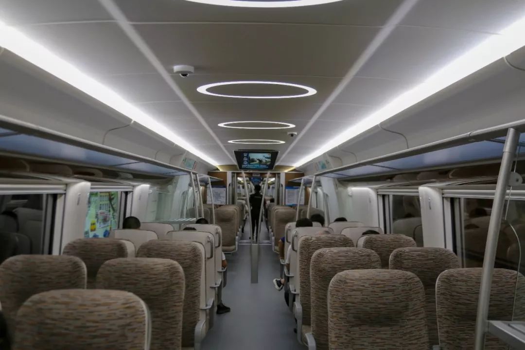 商务车厢商务车厢采用1+2的座位布局,座椅可以调节、旋转方向,并配有小桌板。上方设有阅读灯,座椅还配备了USB充电接口,方便乘客使用。车门上方和立柱上的显示屏同样提供动态双语列车信息。