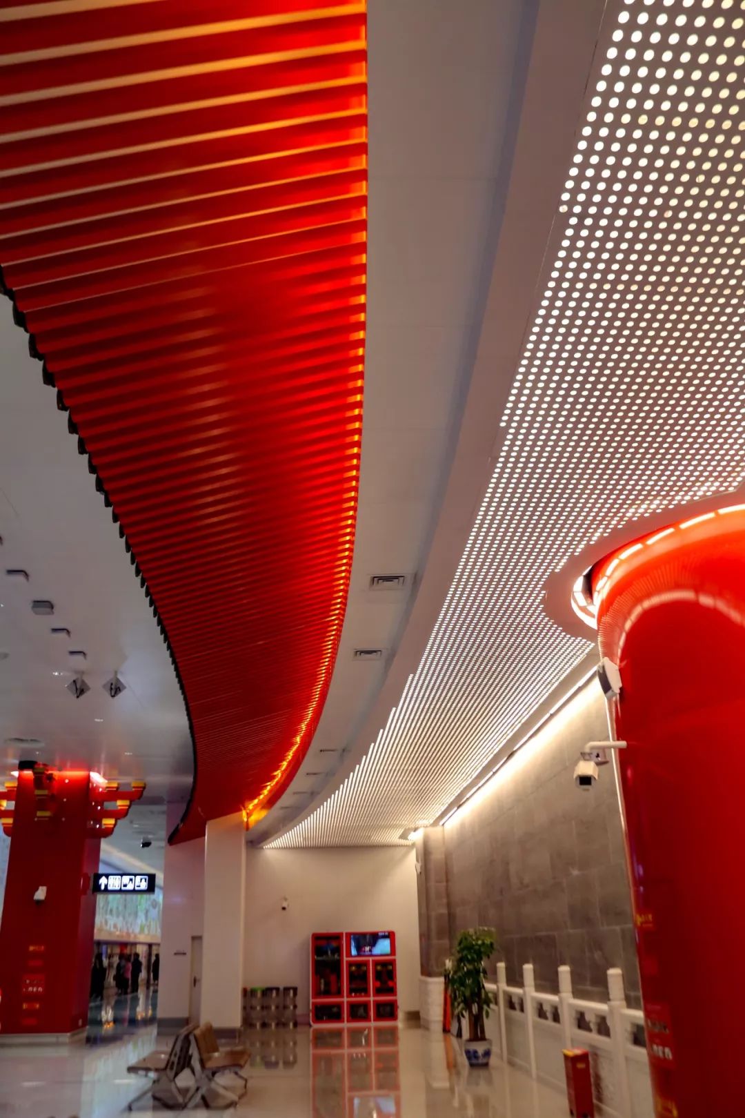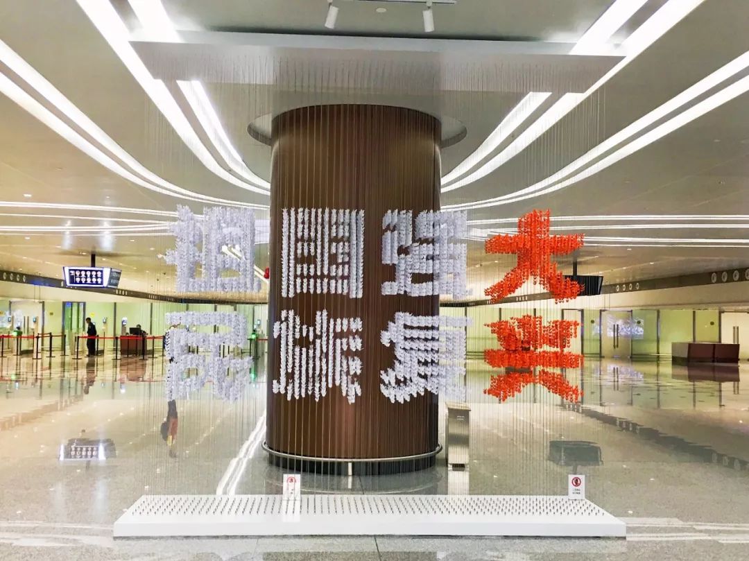 全线所有车站在设计上均以“一带一路”为核心主题。大兴机场站以新时代的“空中丝路”为主题,以行云流水的飘带发散引导客流,以中国红为点缀,配合百米长巷动态艺术投影,象征乘机抵达的乘客从这里踏入“国门”。