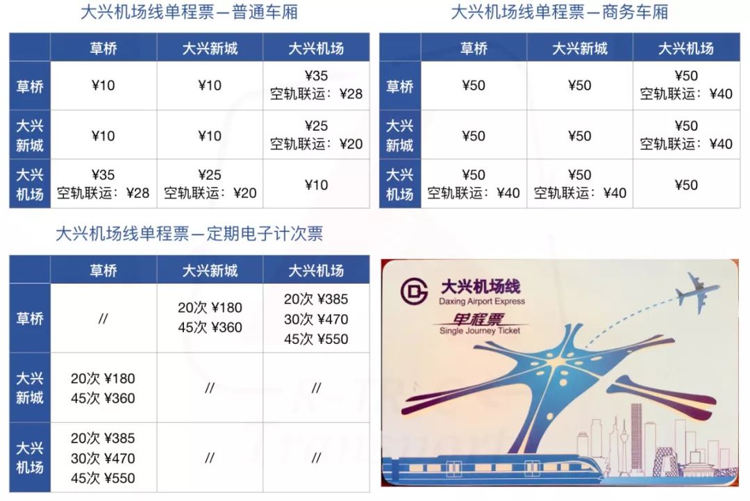 购票与首都机场线类似,大兴机场线单独计价,车票分为普通单程票和商务单程票两种,车票样式与大路网内的单程票有所不同。值得一提的是,商务车厢的单程票收费很有意思:无论从哪里上车,哪里下车,票价均为50元。下图展示了大兴机场线的票制。