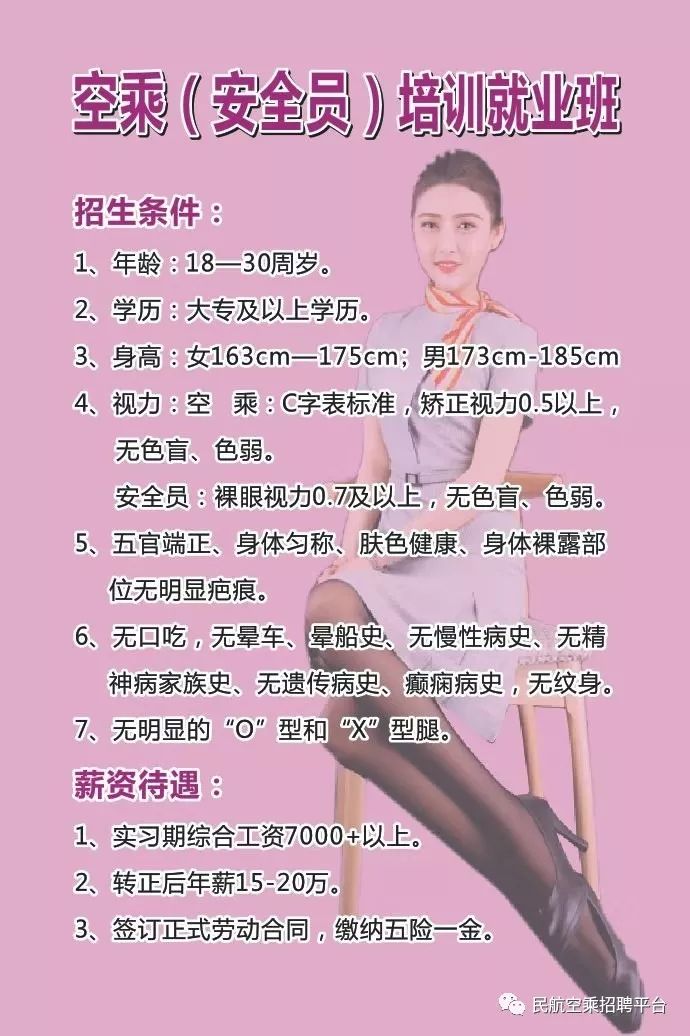 2.女孩为主,身高163以上,男孩少量 人员 化妆,着航空公司制服上岗,无犯罪记录,品貌端庄,口齿清晰、普通话标准,颜值高、气质佳。