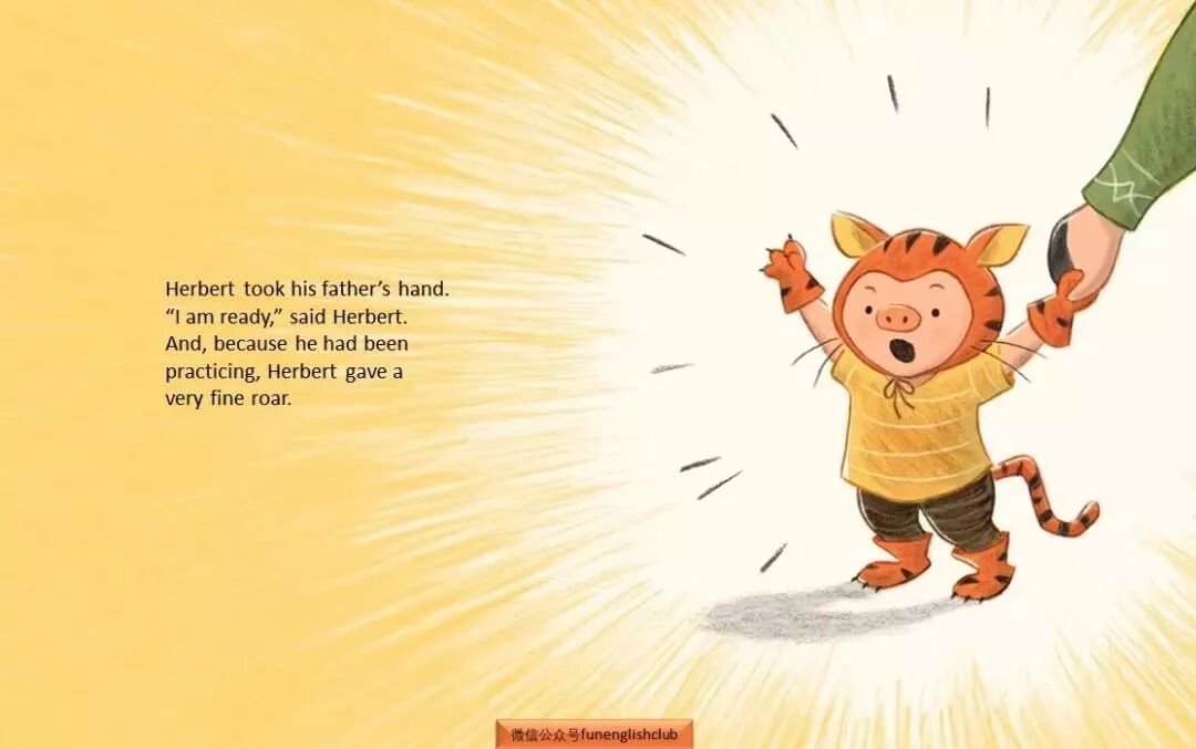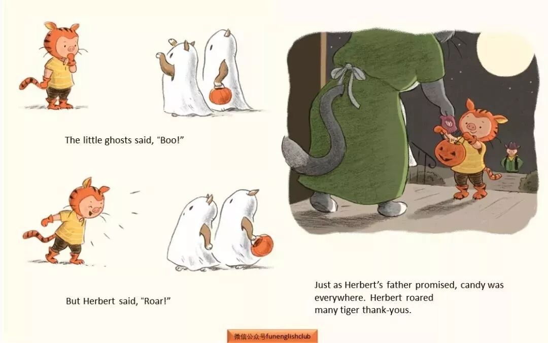 赫伯特是一只可爱的小猪,今年是他的第一个万圣节,他有些害怕,也有些担心。但是在他的爸爸的帮助和陪伴下,赫伯特准备装扮成老虎并不断地练习咆哮,雕刻好南瓜灯,在万圣节前夜出门去讨糖。