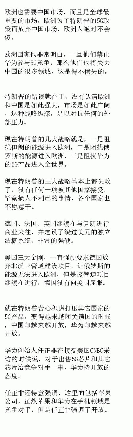 中国和欧洲的市场都很大,光中国自己的市场,就足以支撑华为5G产业的快速发展,欧洲同样如此。