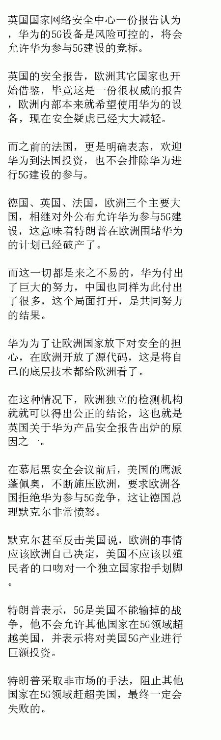 德国政府对外公开表示,华为可以参与德国的5G竞争,这让特朗普在欧洲围堵华为的计划破产了,华为迎来了重大的胜利。