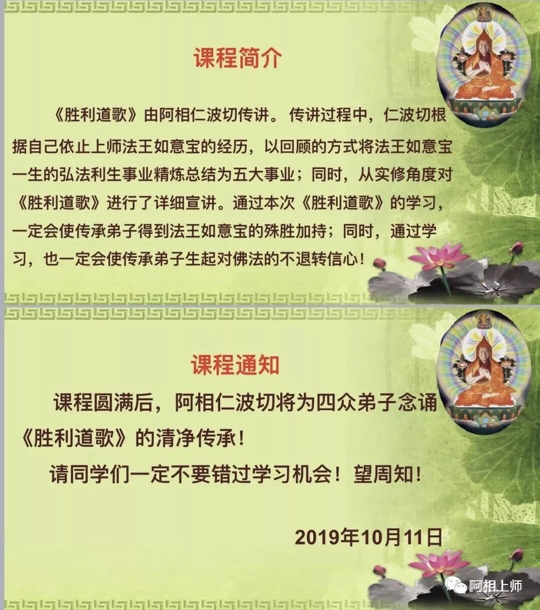 1. 阿相仁波切将于2019年10月27日(本周日)晚20:00传讲《胜利道歌》: