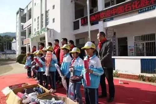 在安徽岳西的扶贫行动中,50名职工到响肠镇石化希望小学,满怀爱心的捐赠文体用品。小学操场上,学生们队列整齐,电子屏热情洋溢的欢迎词,志愿者满怀深情的祝福语,孩子们响亮热烈的鼓掌声,让学校充满浓浓的爱意,让每位参与者感受到爱的暖流。尤其是他们给少先队员捐赠文体用品、少先队员给他们献红领巾时,双方情感与眼神的交流,使大家备感亲切。