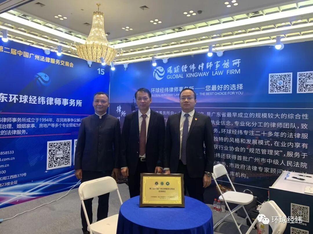 本次法交会汇聚了粤港澳知名的法律机构,参展单位面向过千家龙头企业。本次交易会以现场宣讲、主题展示以及分展位展示的形式举办。在开幕仪式上,广州市律师协会会长、环球经纬律师事务所所高级合伙人邢益强律师,中国广州仲裁委员会王天喜副主任、广州市工商业联合会陈立副主席等为各参展单位颁发“支持单位牌匾”。广东省湖南醴陵商会顾问、环球经纬律师事务所高级合伙人孙兵文律师代表环球经纬律师事务所上台接受牌匾。