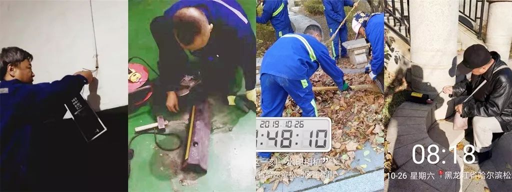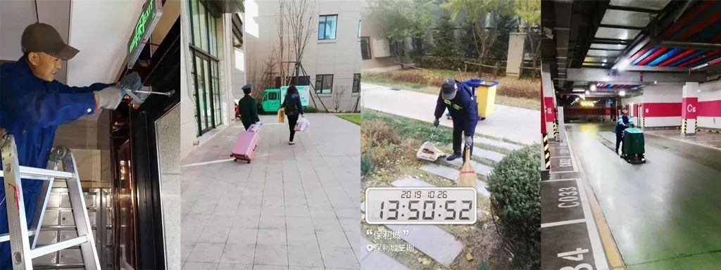 10月26日,保利城物业服务中心工程部员工维修单元门;秩序部员工帮助业主拿行李回家;环境部员工清扫园区落叶、清理地库卫生。
