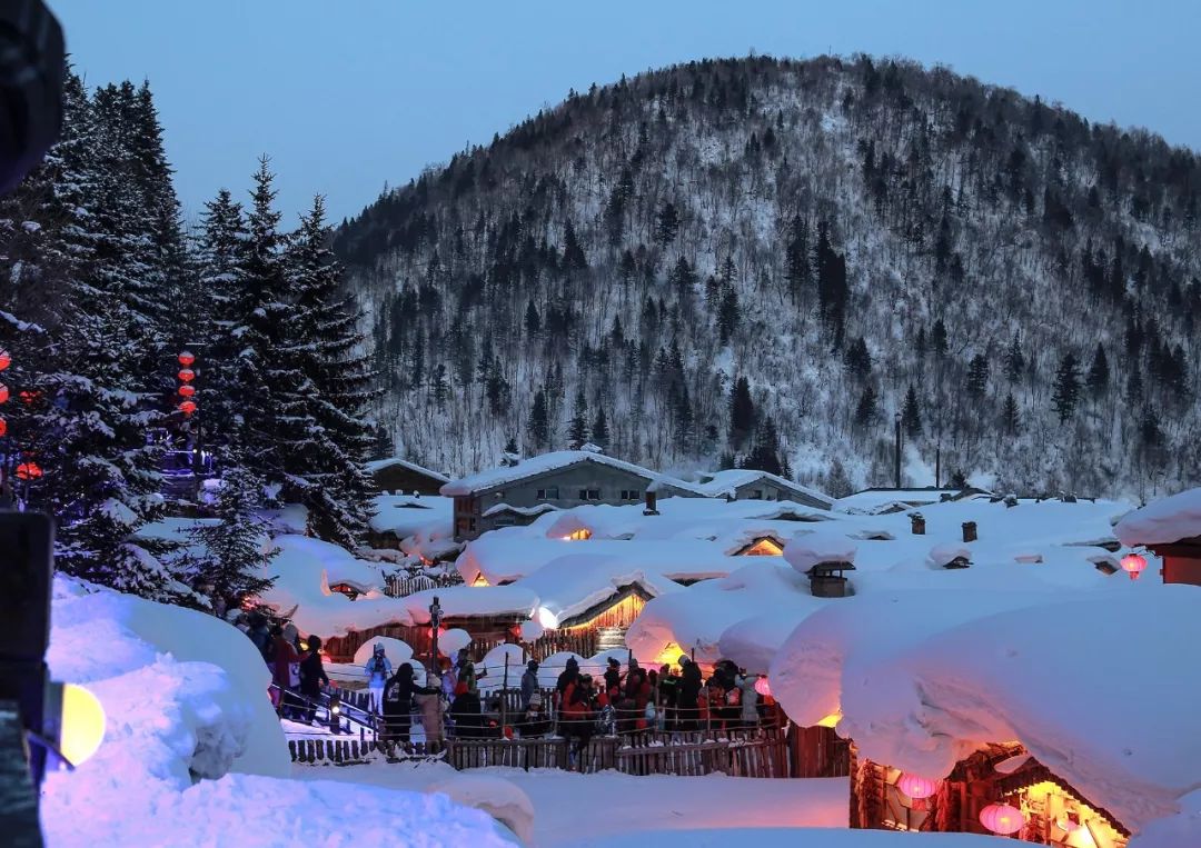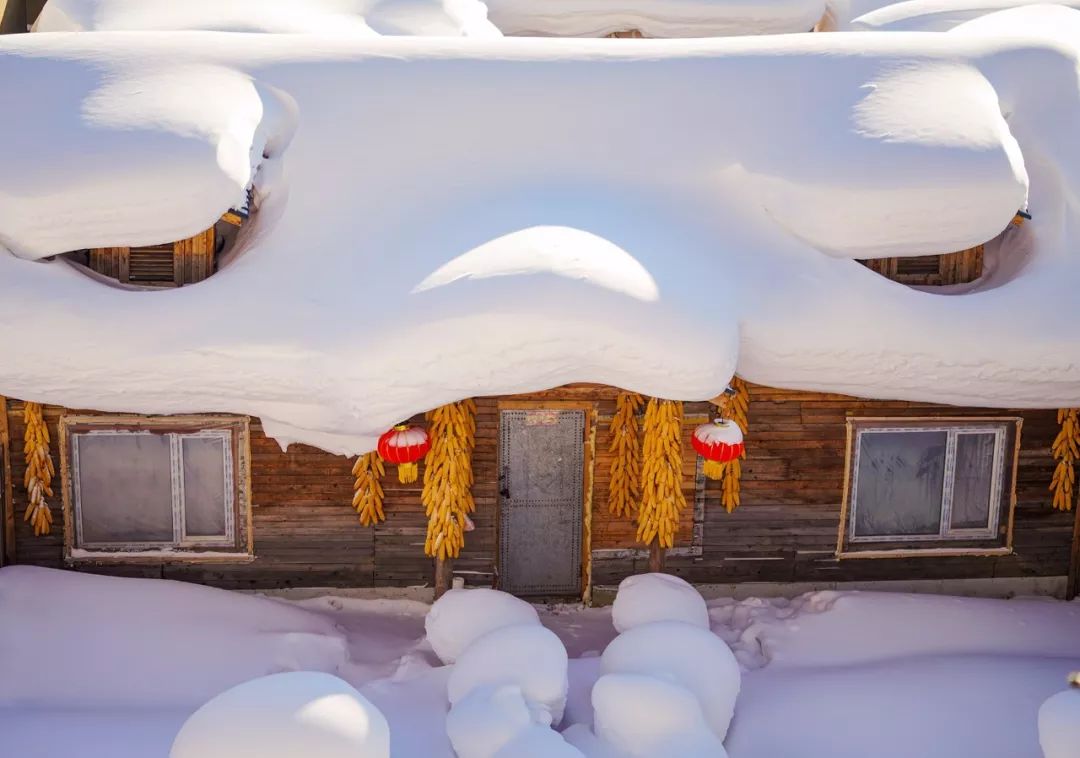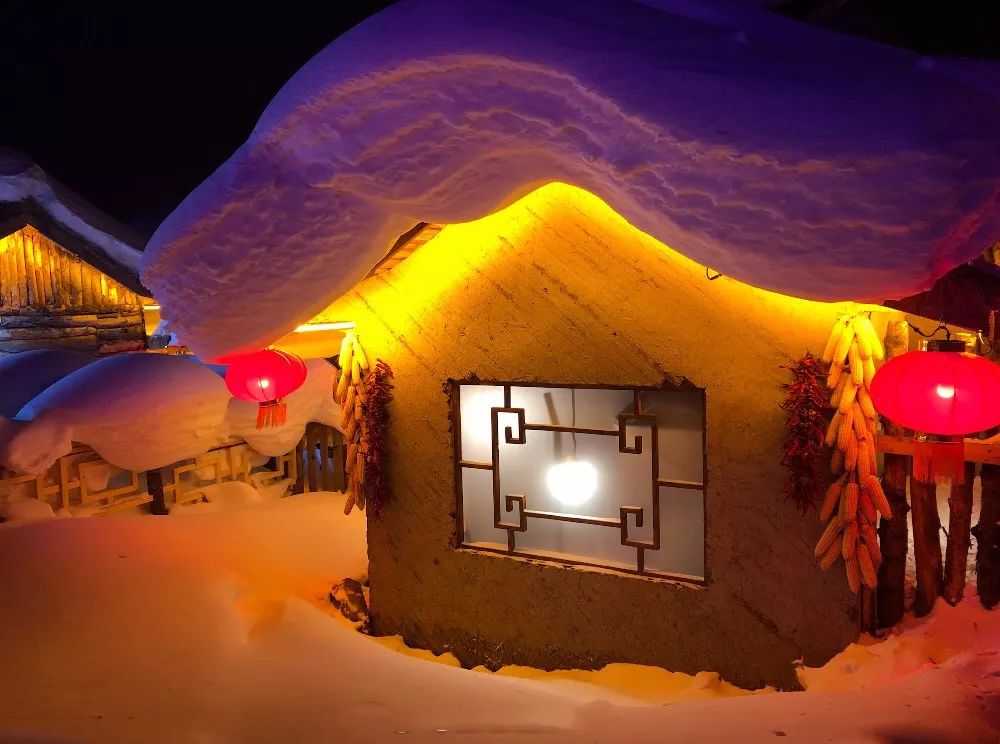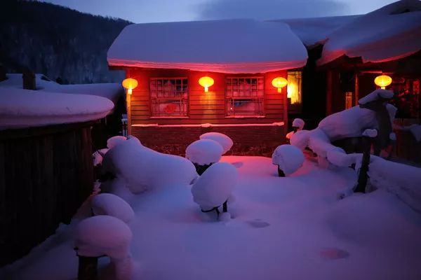 这里虽然寒冷至极,但厚厚的积雪与木屋相衬的那份美感,有种莫名的温情和亲近感,夜晚一座座漂亮的“雪蘑菇”映着大红灯笼,像极了童话绘本里的世界。
