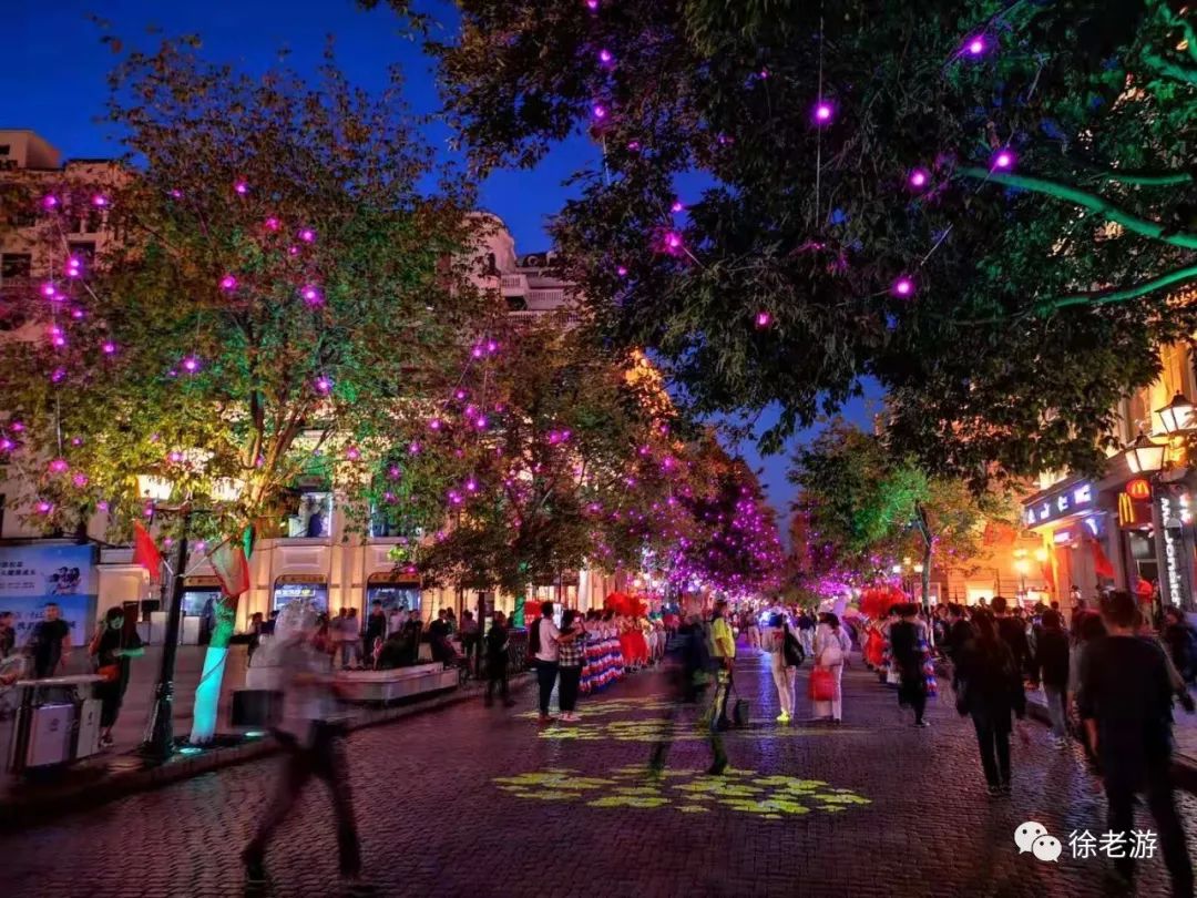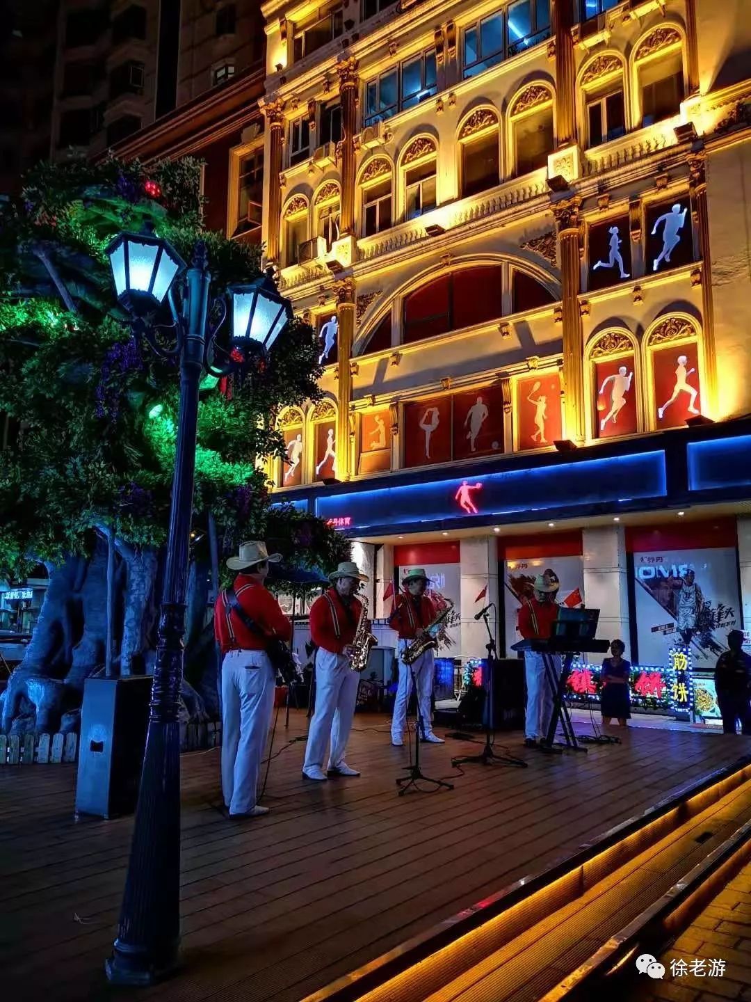 百年老建筑马迭尔旅馆专门把两个阳台改成了舞台,定时有俄罗斯小提琴手风琴演出,引得很多人驻足观看。而在现场灯光变幻之下,驻足观看者本身也成为了风景。这些人因为看表演聚集在了一起,又共同成了别人眼中的风景,一个并不复杂的举措,激活了整段街区。
