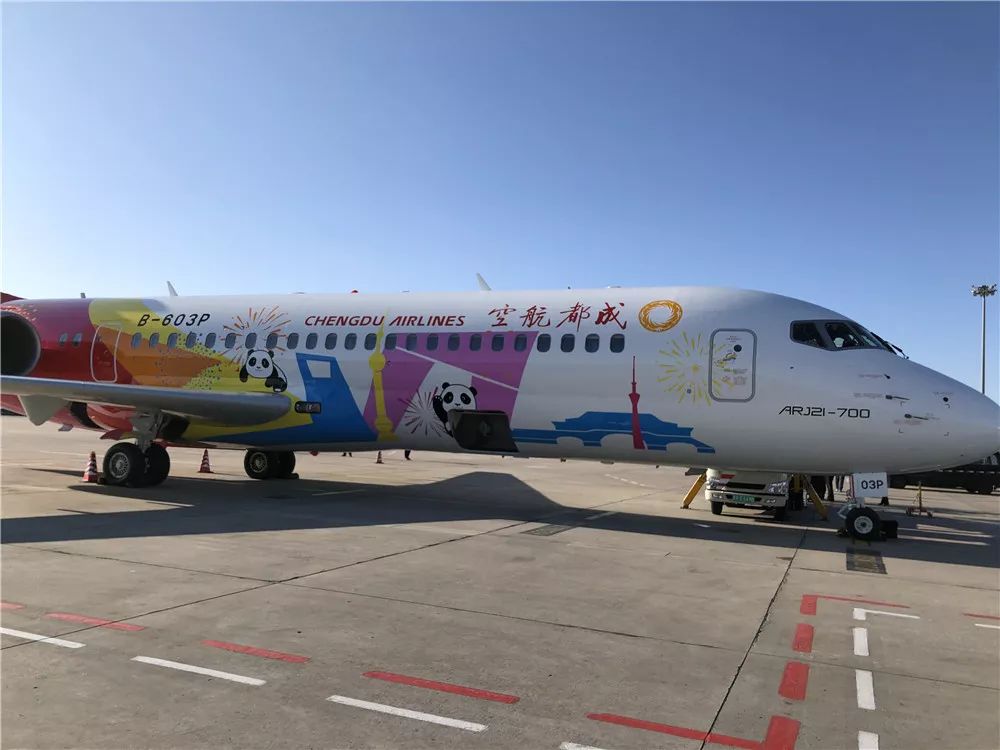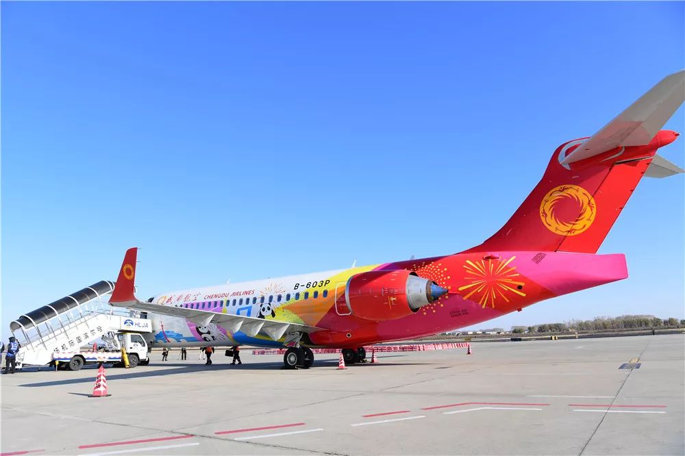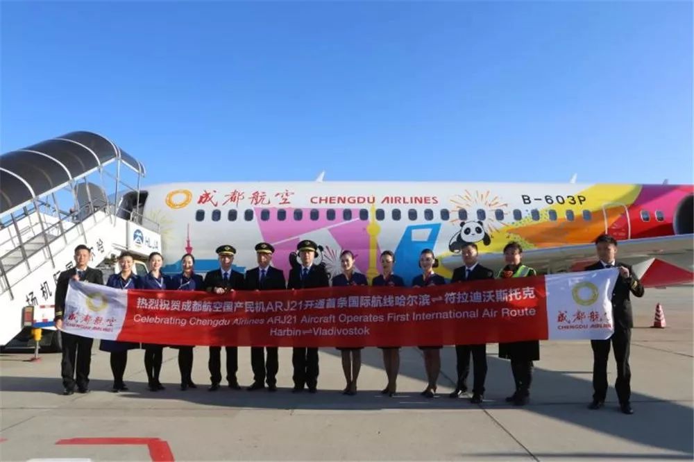 26日,一架身披成都航空航徽“太阳神鸟”涂装、国籍注册号为B-603P的国产喷气支线客机ARJ21飞机从哈尔滨太平国际机场起飞,历经1小时多飞行,平稳降落在符拉迪沃斯托克国际机场,这标志着ARJ21飞机首条国际航线成功开通,国产喷气支线客机商业运营实现新跨越。