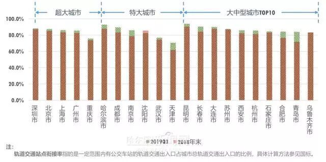 今年三季度相比2018年末,国内绝大多数城市轨道交通站点衔接率均有提升。哈尔滨、昆明、长春和大连4个城市的衔接率超过90%,说明这些城市的公交站点与地铁站出入口的连接情况得到明显改善,且高德地图交通数据显示哈尔滨在特大城市中轨道交通站点衔接率排名第一,为93.0%。