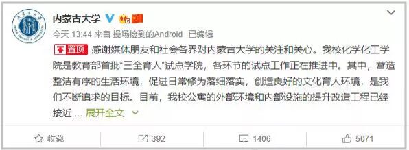 感谢媒体朋友和社会各界对内蒙古大学的关注和关心。我校化学化工学院是教育部首批 " 三全育人 " 试点学院,各环节的试点工作正在推进中。其中,营造整洁有序的生活环境,促进日常修为落细落实,创造良好的文化育人环境,是我们不断追求的目标。目前,我校公寓的外部环境和内部设施的提升改造工程已经接近尾声。学院通过加强日常管理维护良好的公寓环境,是同学们的共同心愿,也得到了绝大多数同学的理解支持。