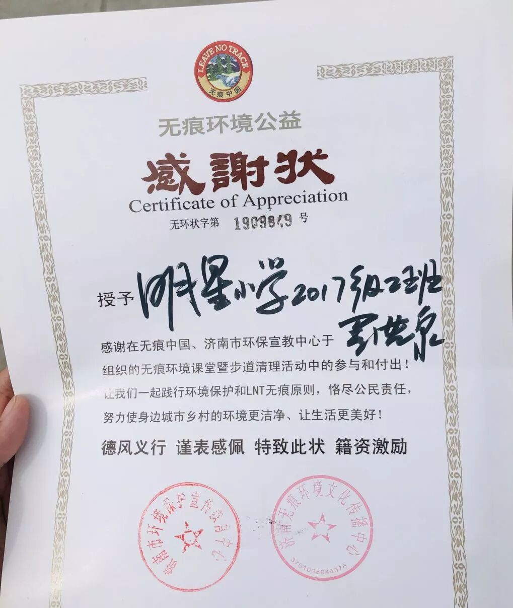 活动结束了,志愿者老师为我们明星的队员们颁发了环保证书,这可真是最珍贵的赞赏和激励。此次志愿服务活动,以小手拉大手的形式,让身边更多的人关注城市环境,树立保护环境的生态文明意识。未来的日子里,我们一定会注意环保、宣传环保,从自身做起,向志愿者老师们那样,为泉城的环保事业贡献力量!
