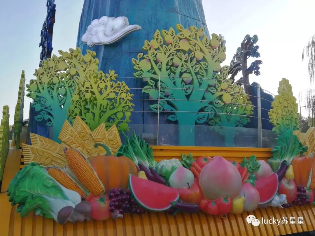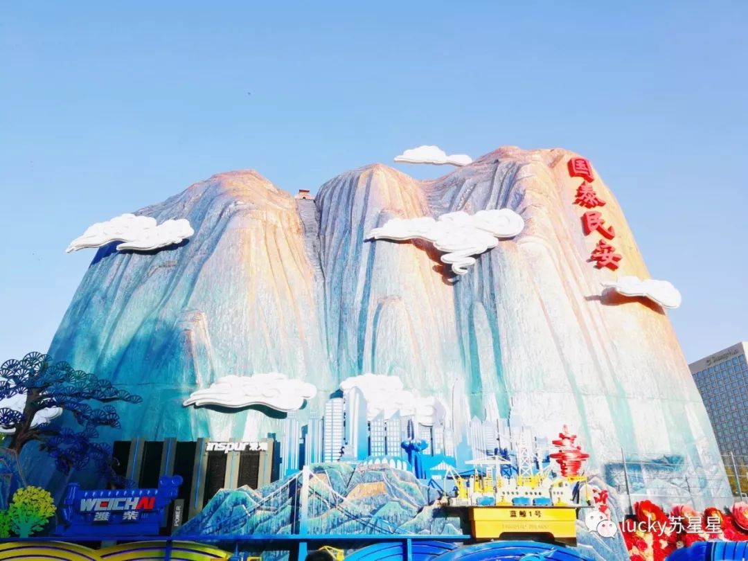 泉城广场上正有山东国庆彩车的展示,我们去看了。其实和电视上的效果很不一样,在电视上只能看到一座泰山,但在彩车下面还有很多细节:菏泽牡丹(可以开合)、青岛的风、沂蒙情、寿光蔬菜、蓝鲸号、浪潮、潍柴。