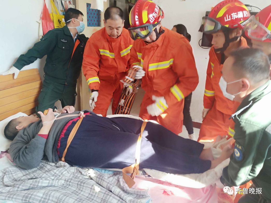 2019年10月25日下午1时许,济南消防白马山中队接到群众报警:东红庙北路某小区,一居民因不慎将脚扭伤,急需送医救治。但是由于该居民体重 过大,到场的120医护人员人单力薄只能拨打119求助。接警后,济南消防白马山中队迅速赶赴现场。