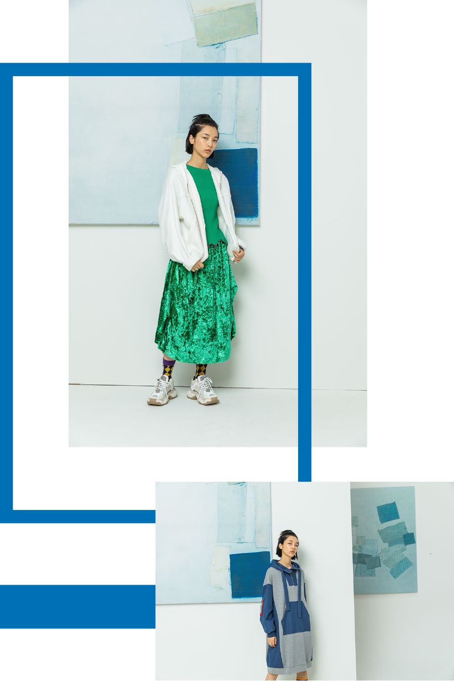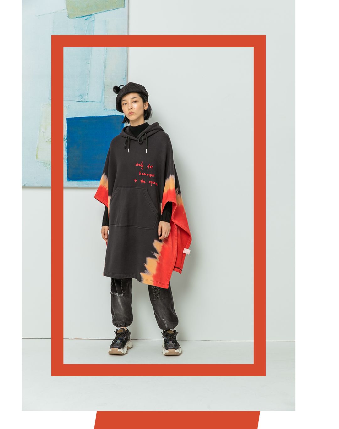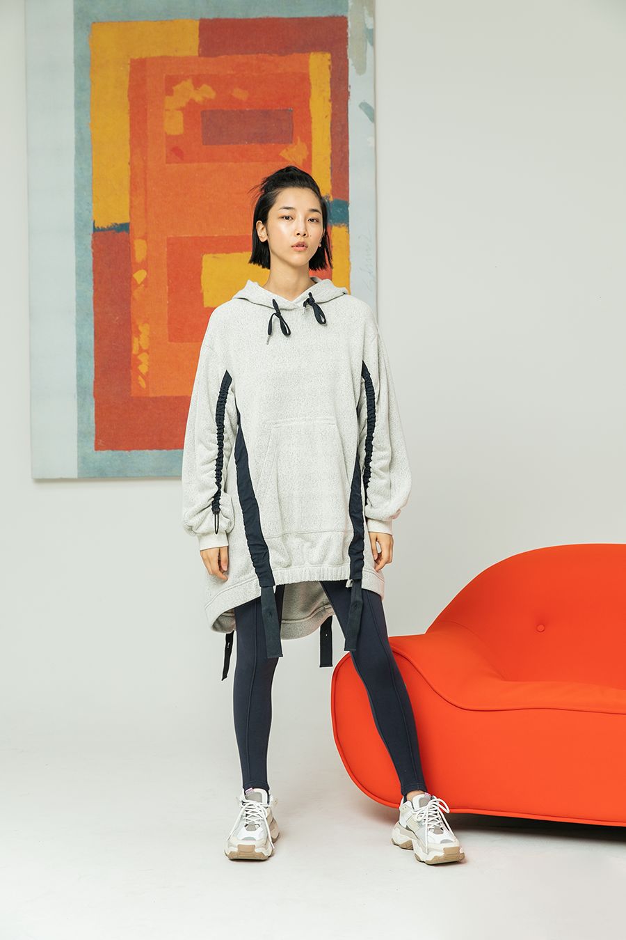 破烂风格毛织与飘逸纱裙的搭配组合产生强烈对比,但穿着时整体看起来轻柔浪漫。长款卫衣搭配紧身长裤或者彩色长袜,轻便且具有廓形感。