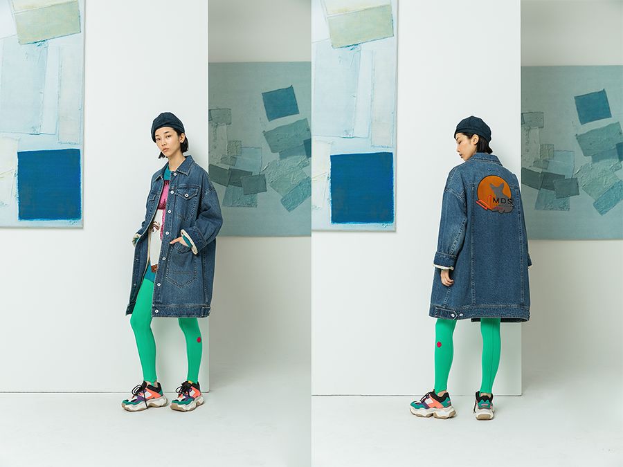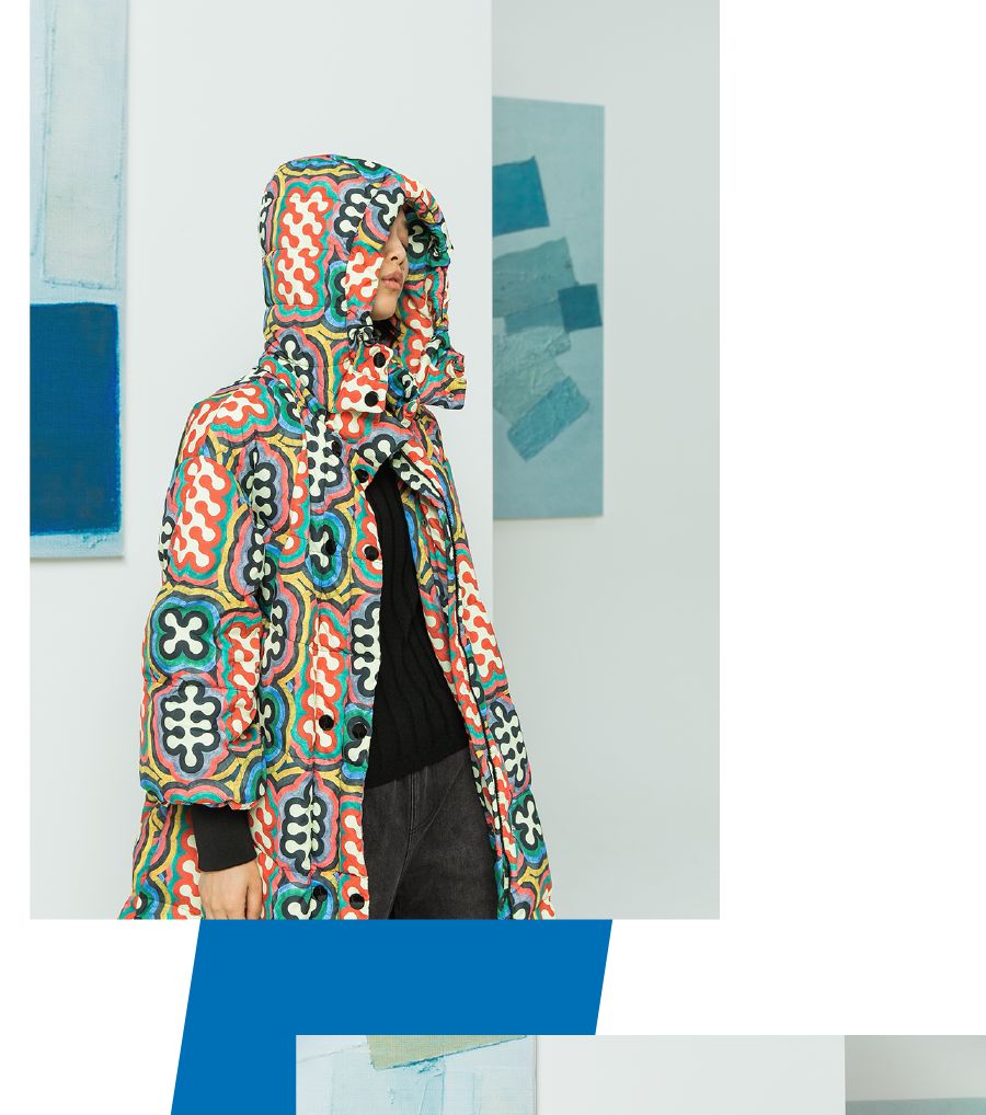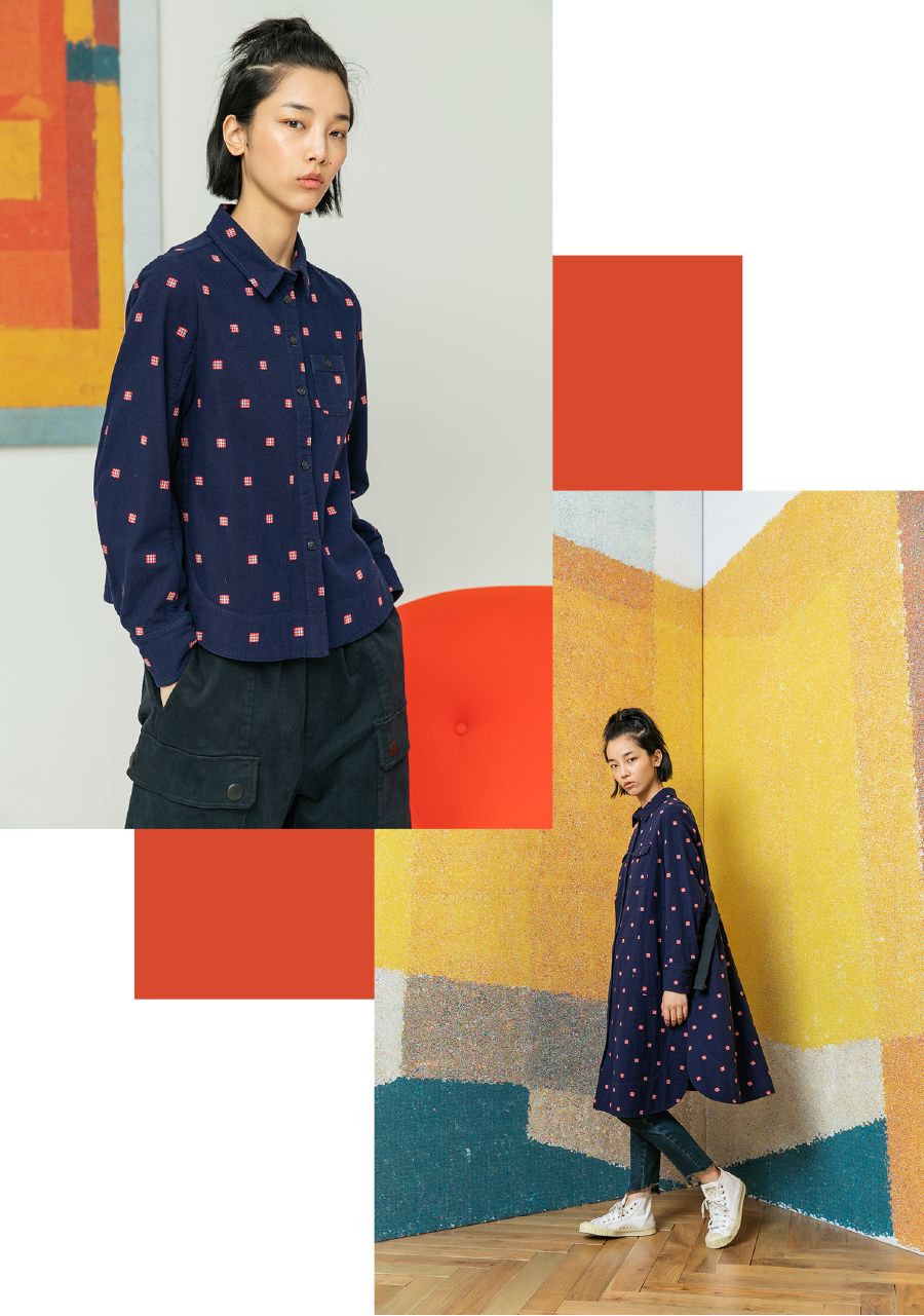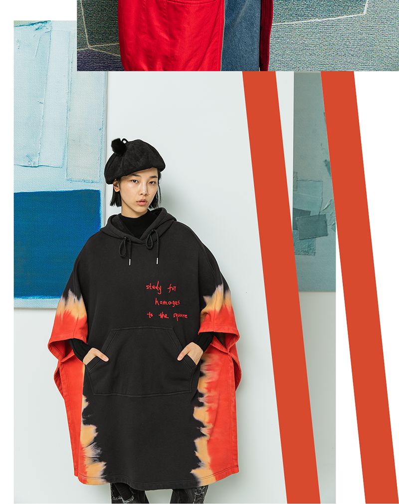 服装结构上采用了大量的分割线,增加服装细节与层次感的同时能让廓型更为立体。正方形作为主题元素也运用在了印花、绳绣章等工艺上,使服装从多角度与亚伯斯的作品产生呼应。