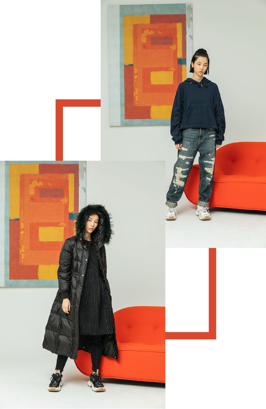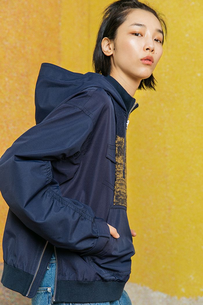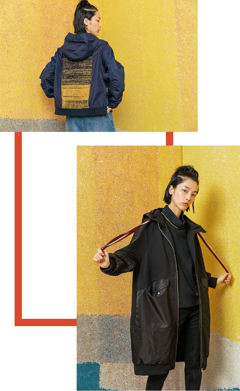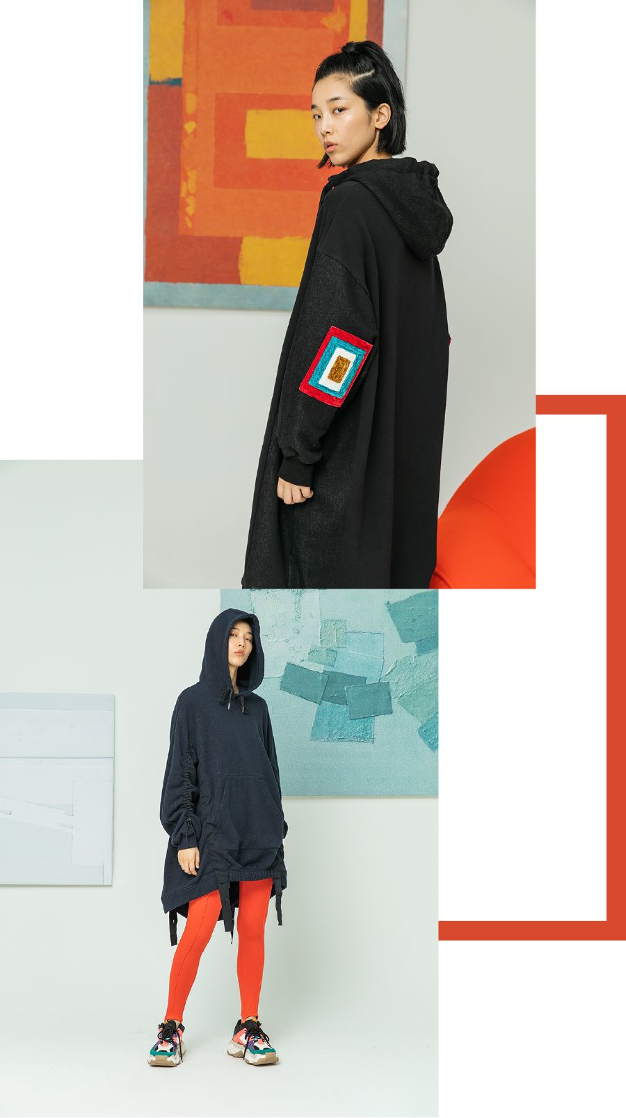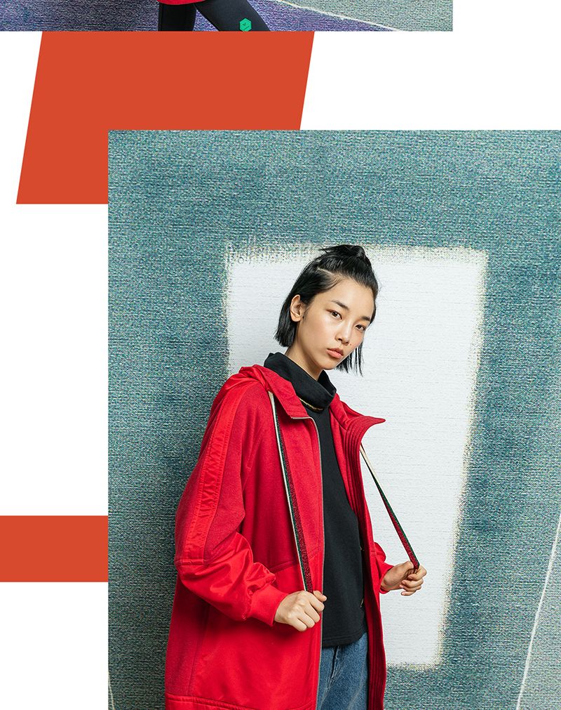 卫衣采用了厚实保暖的面料,可内搭可外穿,造型效果多样。外套则使用具有光泽度的面料,设计简洁又十分醒目。