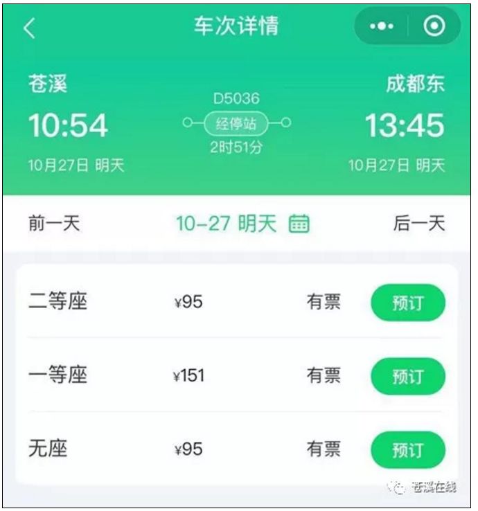 1、自10月27日起阆中-广元D5039次开行;全程票价二等座35元,一等座57元;