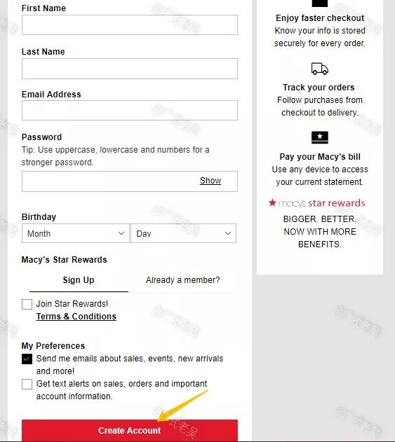 3、进入注册页面,然后依次填写你的“姓名、邮箱、密码、生日”,再点击“Creat Account”即可注册成功。
