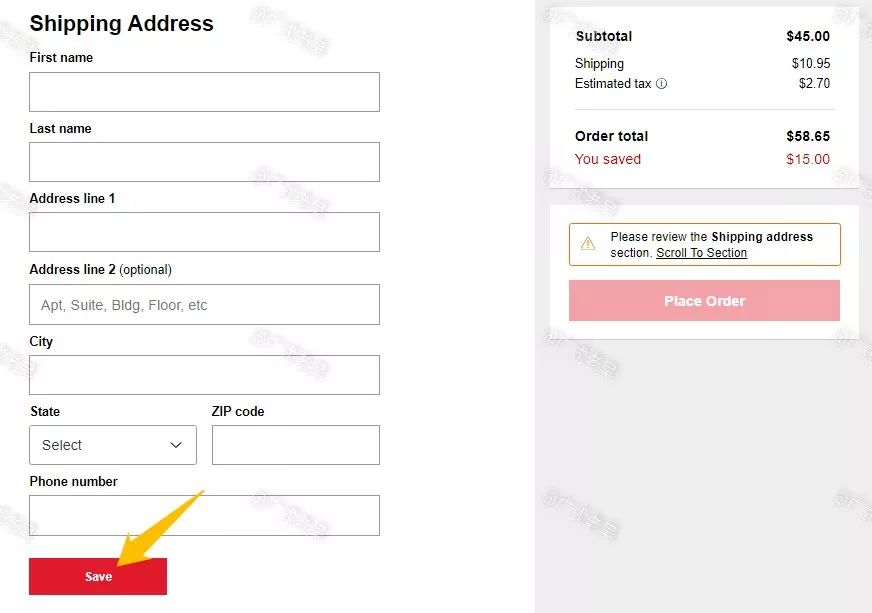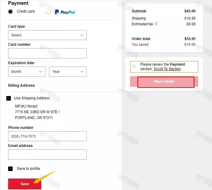 13、最后确认好信息,选择支付方式,填好信息,先点击“SAVE”,再点“PLACE ORDER”进行付款。