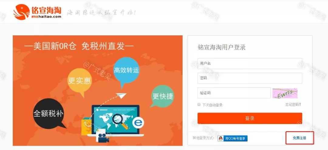 8、以铭瑄海淘公司为例,在百度搜索转运公司的名字进入官网,然后点击左下角的“免费注册”。