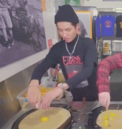 吴亦凡摊煎饼也很搞笑,小心翼翼跟着旁边师傅学习,正对自己的作品得意的时候,刚打上去的鸡蛋一不留神就跑了,吴亦凡瞬间就懵了。