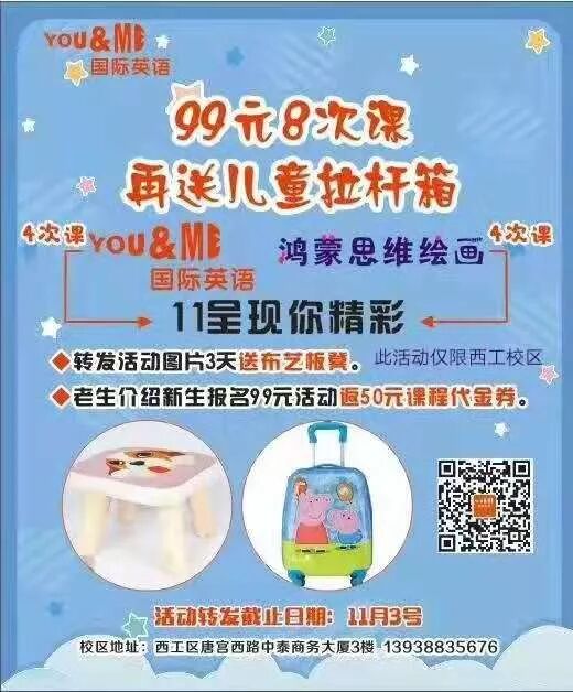 活动内容:99元即可获得价值99元的礼品+4节价值199的英语课+4节价值199的绘画课