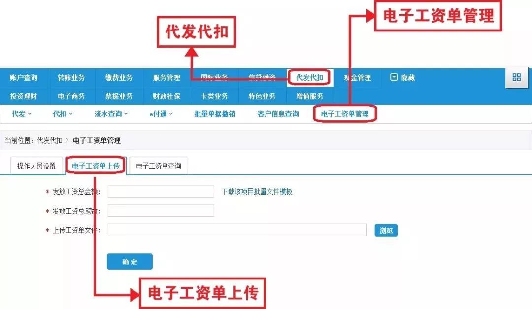 企业上传工资单 :具备电子工资单上传权限的操作员登录企业网上银行,点击代发代扣/特色服务→电子工资单管理→电子工资单上传,进入电子工资单明细上传页面。