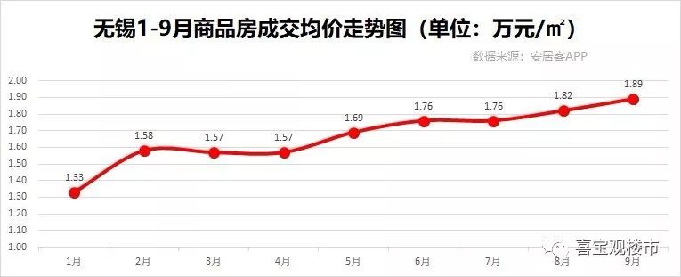 纵观前三季度,无锡商品房成交呈现明显的上扬趋势,据安居客新房数据中心统计,1月份无锡商品房备案成交均价为1.33万元/㎡,而到了9月份,无锡商品房备案成交均价为1.89万元/㎡,大半年的时间,均价上涨0.56万元/㎡,环比涨幅达42.11%。