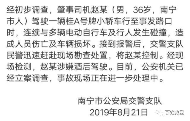 在8月21日的时候,也就是昨天晚上的时候,广西南宁东葛葛村路路口发生严重的交通事故,造成了多人的受伤,通过监控的视频看到一辆灰色小车连撞多辆小车、电动车和行人,现场也是一片狼藉,事故造成了多人受伤,根据南宁交警进一步的调查与报道现在已经是2人死亡7人受伤,受伤人员情况稳定,经过现场的检测,男司机涉嫌酒驾,已经被公安机关控制,目前事故正在进一步调查中。