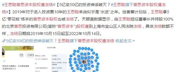 10月18号,网络上有媒体爆料,王思聪名下“普思资本”股权遭冻结。早在3个月前,王思聪名下的“香蕉计划”公司的股权也被冻结过一次,足有270万元人民币,目前王思聪名下冻结股权累计已经超过8445万元人民币。