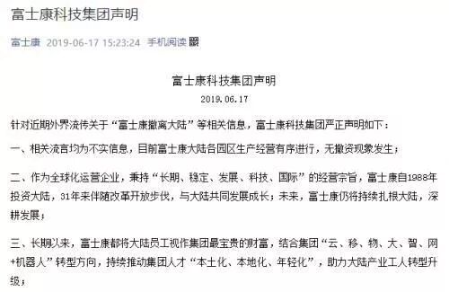 针对近期外界流传关于“富士康撤离大陆”等相关信息,富士康科技集团声明称:相关流言均为不实信息,目前富士康大陆各园区生产经营有序进行,无撤资现象发生;未来,富士康仍将持续扎根大陆,深耕发展;针对近期个别自媒体刻意曲解事实、恶意抹黑富士康的行为,富士康将保留通过法律手段维护集团形象及利益的权利。