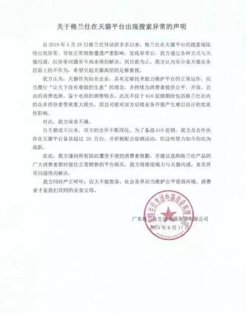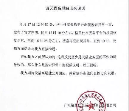 此前,格兰仕发表公开声明称,自2019年5月28日拜访拼多多以来,格兰仕在天猫平台的搜索端陆续出现异常,导致正常销售遭遇严重影响。对此,天猫相关负责人回应称,在App上搜索“格兰仕”显示都是正常的。而格兰仕通过其微博再次发发表声明《请天猫高层站出来说话》,提到搜索出现反复异常至少是天猫业务层的不作为所导致的,并附视频说明。(36氪)