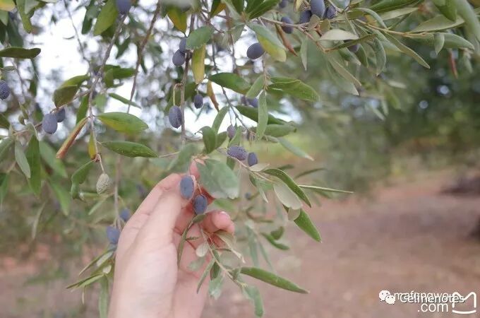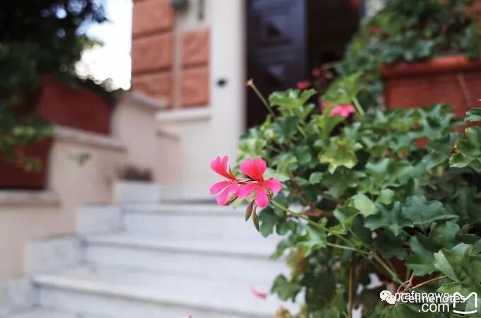酒店房间门外,近处是盛放的三角梅,远处是晨雾未散的橄榄树林。