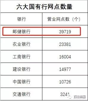 目前,邮储银行拥有近4万个营业网点,要知道“宇宙行”工商银行的网点只有1.6万个左右,网点比较多的农业银行也才为2.6万个,邮储银行绝对是名副其实的“巨无霸”。