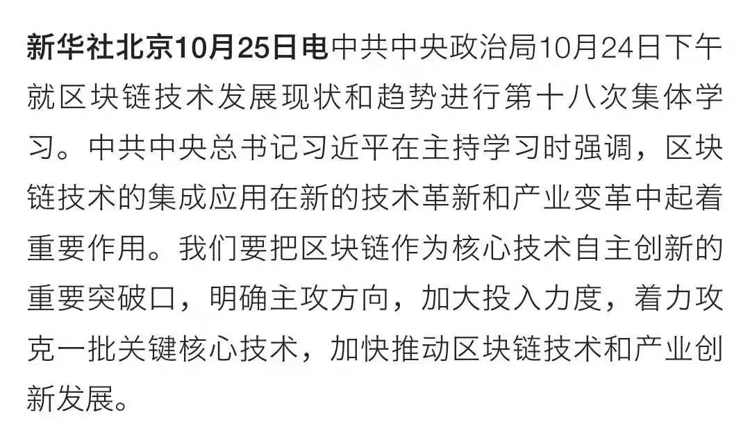 在 10月 24 日下午,中央政治局第十八次集体学习会议上,强调了:把区块链技术作为核心技术自主创新的重要突破口,明确主攻方向,加大投入力度,着力攻克一批关键核心技术,加快推动区块链技术和产业创新发展。